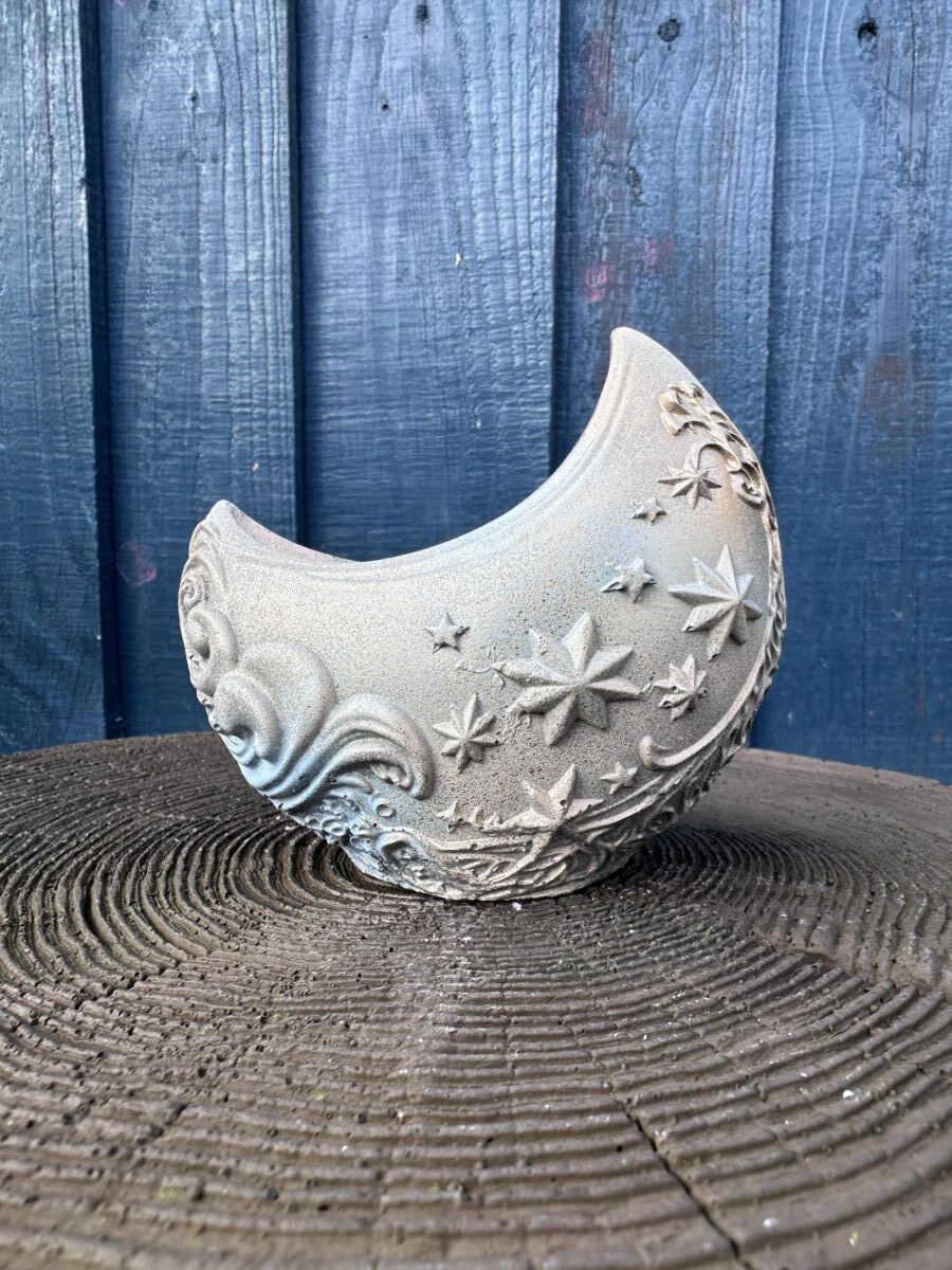 Bring the night sky indoors with this unique, cement Celestial Crescent Planter. Intricately carved with stars and clouds, its distressed finish makes it a mystical centerpiece for indoor plants and decor.