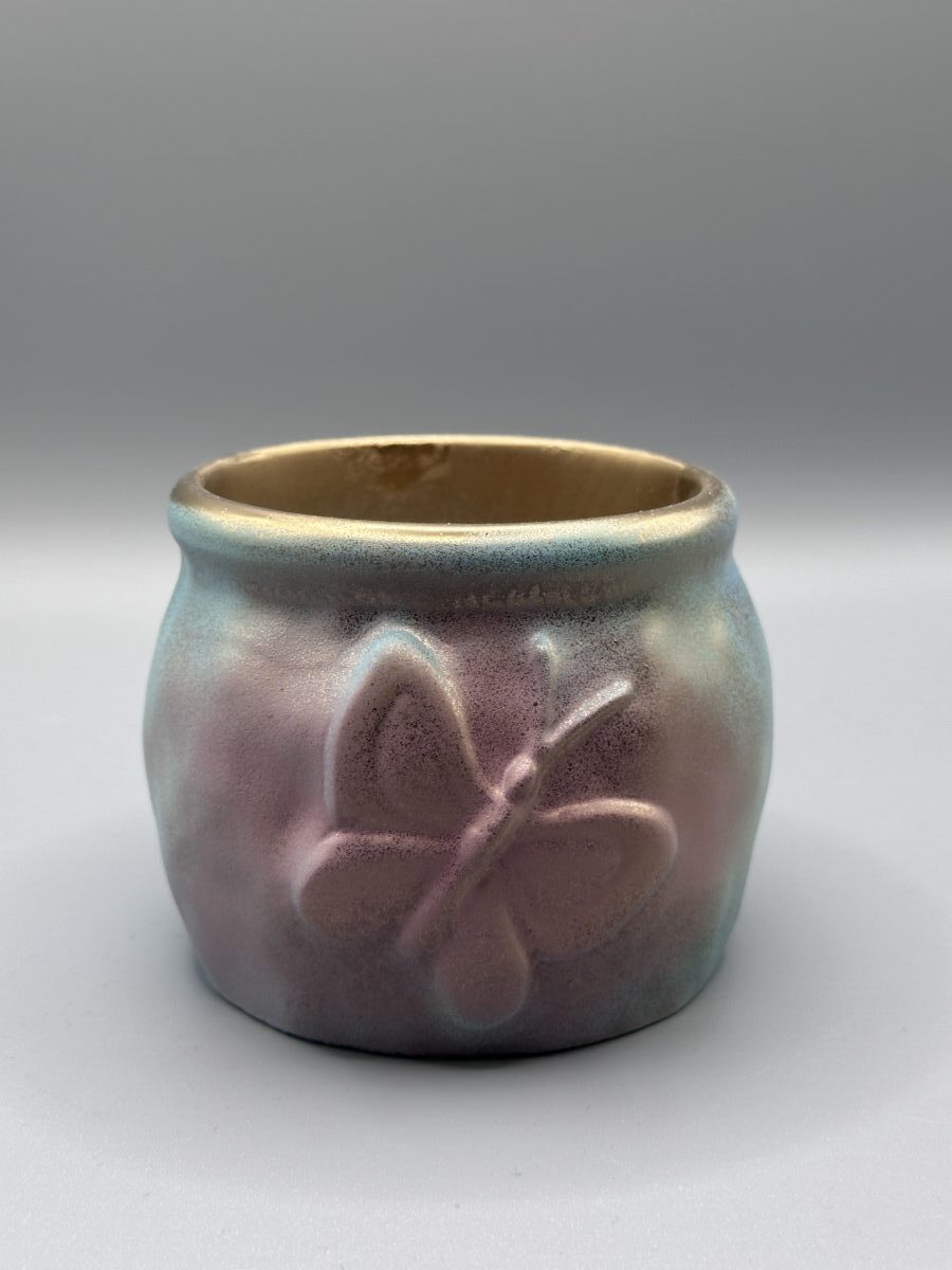 Transform your favorite nook with a vessel that celebrates growth and beauty. This charming, rounded pot features an embossed butterfly silhouette that seems to take flight against a dreamy, watercolor-inspired background. The surface is hand-finished with a fine-grain texture, offering a matte feel that contrasts beautifully with the metallic gold rim and shimmering highlights.