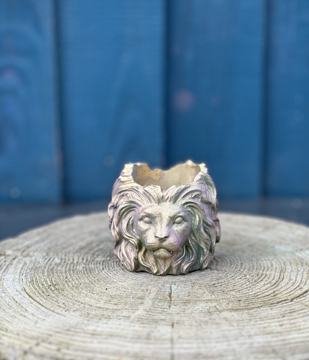 Channel the majestic spirit of the jungle with this intricately carved lion’s head planter. Featuring a weathered, stone-like texture, it is finished with a mesmerizing iridescent glaze that shifts between muted golds, greens, and soft purples as it catches the light. This rugged yet refined piece adds a touch of ancient mythology and bold character to your indoor jungle.