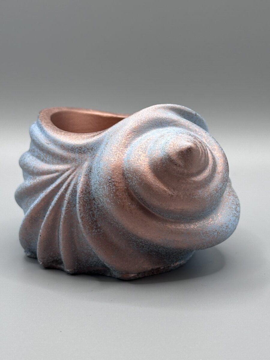 Inspired by the organic curves of a conch shell, this hand-cast vessel brings a mesmerizing shimmer to any space. The exterior features a stunning rose-gold metallic glaze with a delicate, crackled texture that catches the light from every angle, creating a dynamic sense of movement. Its deep, rounded basin is perfect for cradling small air plants, jewelry, or crystals, blending seaside whimsy with a high-end, polished aesthetic.